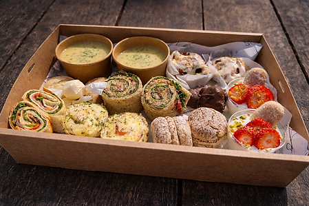 De brunch wordt geleverd in een mooie doos met een menukaartje en een roos.